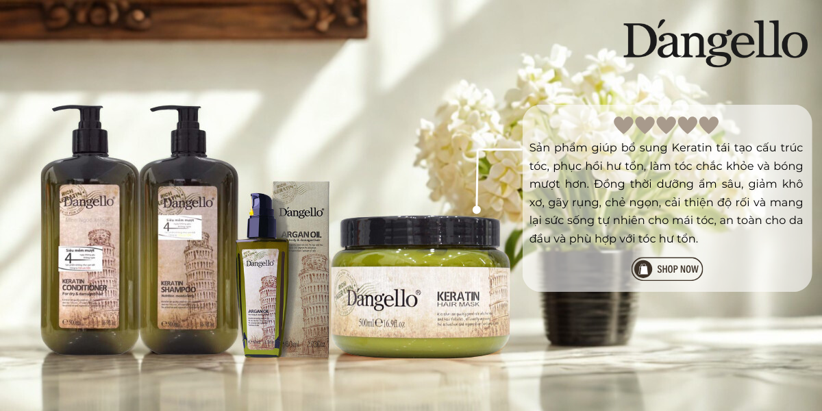 Keratin là 1 thành phần chiếm tới 80% trong cấu tạo tóc, nó chính là 1 loại Protein có tác dụng bảo vệ tóc tránh khỏi những hư tổn và kéo dài vẻ đẹp cho tóc. Khi tóc được phủ Keratin, chất này sẽ làm đầy các khoảng trống bị mất trong biểu bì tóc, giúp tóc khoẻ mạnh và cải thiện được các vấn đề tóc gãy, tóc rối hư tổn vì sử dụng nhiều hoá chất. Dùng dầu gội DANGELLO để bổ sung Protein tái tạo chất sừng cho tóc bóng mượt các bạn nhé .