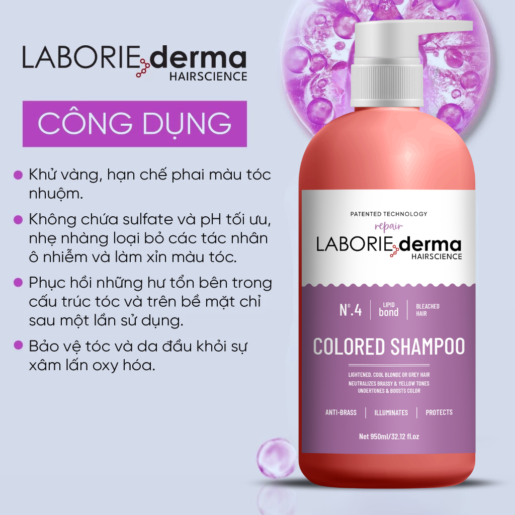 Dầu gội Laborie Derma được thiết kế chuyên biệt cho tóc tẩy nhuộm, giúp khử vàng và trung hòa tông màu đồng thau, duy trì màu tóc bền lâu và sáng đẹp. Công thức cải tiến kết hợp Công nghệ Lipid Bond độc quyền, giúp phục hồi tối ưu cả bên trong lẫn bề mặt tóc, mang đến mái tóc khỏe mạnh, óng mượt mà không bị bết dính hay khô xơ.