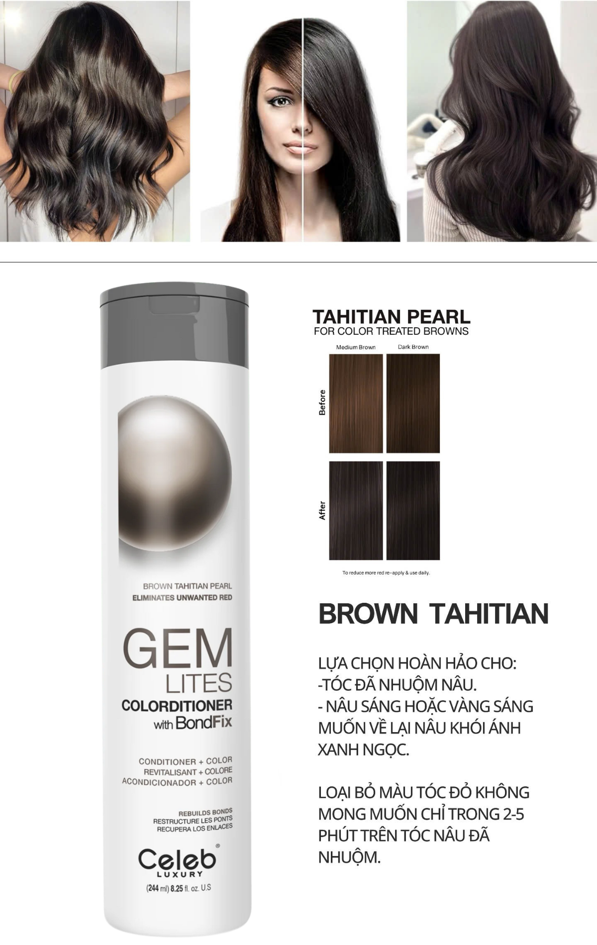 Dầu xả Celeb Brown Tahitian là dầu xả có sắc tố màu nâu lạnh, giúp trung hòa ánh đỏ không mong muốn trên nền tóc nâu đậm, mang lại mái tóc mềm mượt, đều màu và tông màu mát mẻ hơn. Sản phẩm được thiết kế để kết hợp hoàn hảo với dầu gội Gem Lites Brown Tahitian, tạo hiệu ứng màu tối ưu, giữ tóc chắc khỏe, không bị khô xơ.