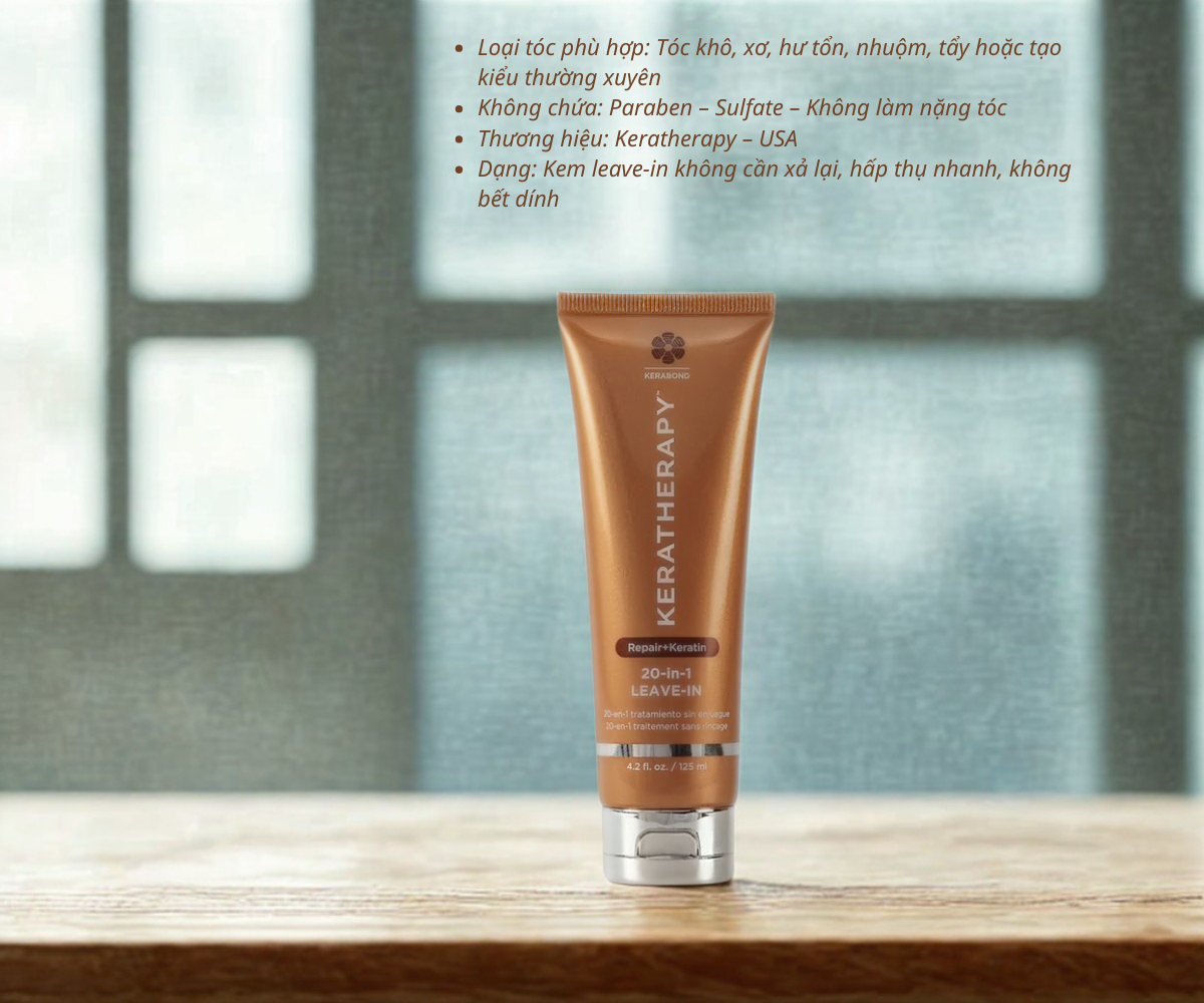Kem xả khô Keratherapy là kem xả khô đa năng cao cấp, mang đến 20 công dụng chăm sóc tóc chỉ trong 1 bước đơn giản, giúp bạn tiết kiệm thời gian mà vẫn có mái tóc mềm mượt, chắc khỏe và rạng rỡ mỗi ngày. Sản phẩm chứa Keratin thủy phân, chiết xuất trứng cá hồi (caviar) và dầu Argan nguyên chất – bộ ba "siêu sao" phục hồi tóc từ sâu bên trong, làm đầy cấu trúc sợi tóc, dưỡng ẩm, bảo vệ tóc khỏi nhiệt, tia UV và ngăn ngừa hư tổn lâu dài.