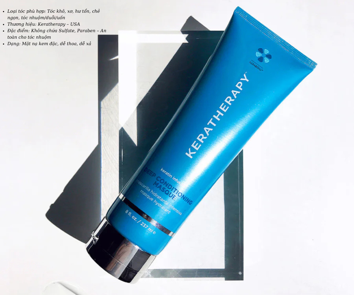 Mặt nạ Keratherapy là mặt nạ phục hồi chuyên sâu dành cho tóc khô, xơ, hư tổn hoặc thiếu sức sống, giúp tái tạo tóc từ bên trong nhờ Keratin thủy phân cùng chiết xuất dưỡng chất từ thiên nhiên. Công thức dưỡng ẩm đậm đặc nhưng nhẹ nhàng, không gây nặng tóc, giúp tóc: