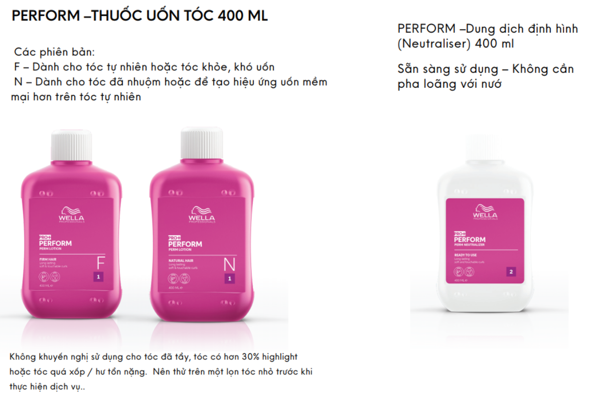 Thuốc uốn Wella Perform Perm là dòng thuốc uốn chuyên nghiệp mang đến những lọn tóc xoăn bền đẹp, đàn hồi tốt, cho cảm giác mềm mại và tự nhiên khi chạm vào. Sản phẩm được thiết kế để đáp ứng đa dạng kỹ thuật uốn và tạo sóng tóc, từ uốn cổ điển đến uốn hiện đại trong salon.